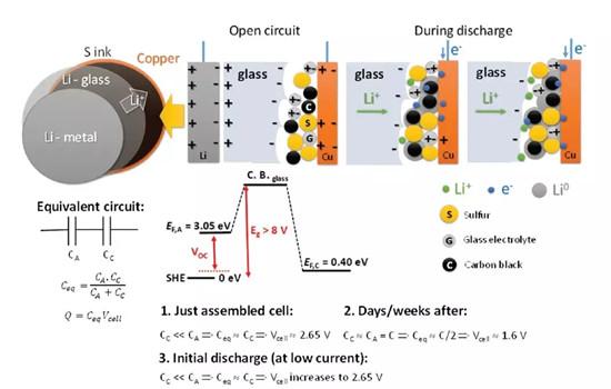 在那篇文章里,他們提出了一種新型的Li-S電池,區(qū)別于傳統(tǒng)的電池,這種電池中的Li和S并沒有發(fā)生傳統(tǒng)的2Li+S=Li2S的化學(xué)反應(yīng),充放電之后S單質(zhì)。也就是說這篇文章似乎要顛覆電池的基本原理—通過化學(xué)反應(yīng)中的化學(xué)能轉(zhuǎn)化產(chǎn)生電能。而文章中對于電池原理的描述如下圖所示: