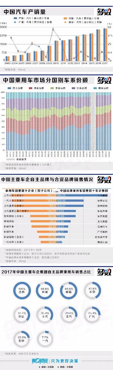 雖然國內汽車產(chǎn)銷量全球第一,但是我們自主品牌的市場份額卻不是很高,全年銷售1084.7萬輛,同比增長3%,占乘用車銷售總量的43.9%。根據(jù)中國汽車工業(yè)協(xié)會公布的數(shù)據(jù)顯示,2017年1-10月汽車生產(chǎn)企業(yè)銷量排名前五的均為合資企業(yè),前十的企業(yè)中僅有吉利控股、長安汽車和長城汽車是自主品牌企業(yè)。
