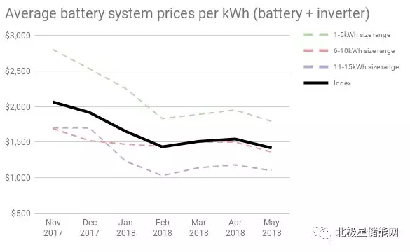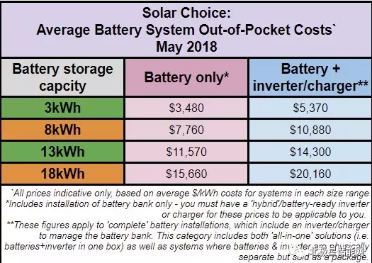 在澳大利亞,按尺寸、類(lèi)別和類(lèi)型(即僅電池和含電池逆變器)電池系統(tǒng)平均成本。圖片來(lái)自2018年5月光伏選擇提供的電池儲(chǔ)能價(jià)格指數(shù)。
