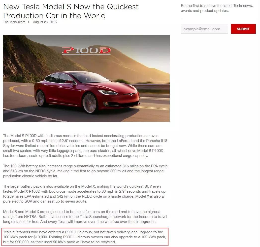 鋪墊完畢,可以說回電池部分了。2016 年 8 月 23 日,特斯拉宣布 Model S P100D 正式投產(chǎn),這款車型對 Model 3 的電池組工藝驗(yàn)證有重要的意義。