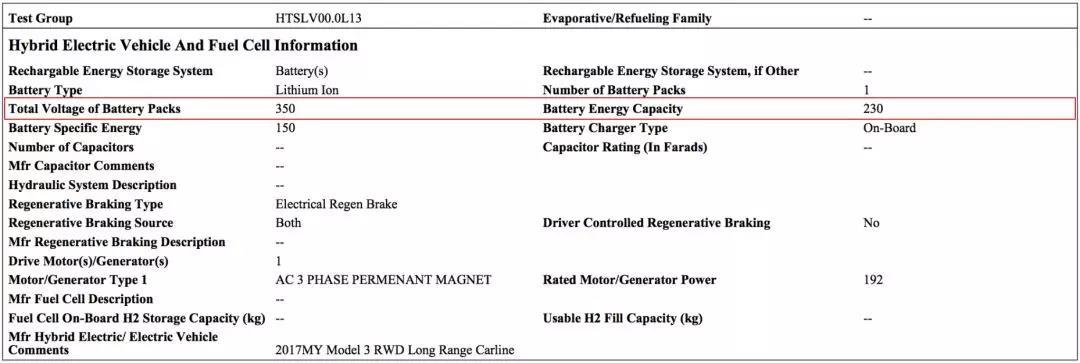 我一度以為,Model 3 的長續(xù)航電池組是 75 kWh。但后來美國環(huán)境保護(hù)署(EPA)的文件顯示,長續(xù)航車型的總電壓為 350 V、電池容量為 230 Ah,這么一算電池組規(guī)格達(dá)到了 80.5 kWh。