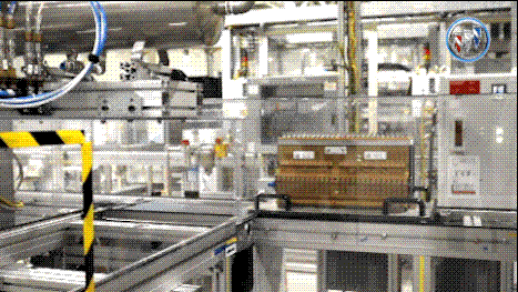對(duì)應(yīng)工業(yè)流水線上,高精度機(jī)器人進(jìn)行電芯堆疊