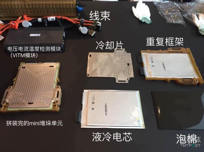 百余個(gè)電芯分為兩組,每組52片。每?jī)善娦窘M成一個(gè) mini 堆垛單元,并通過(guò)流水線焊接在一起形成一組模塊。電芯與電芯之間由鋁制冷卻片隔開,冷卻液通過(guò)注水口注入,填充冷卻片上的“毛細(xì)管”,循環(huán)流動(dòng),控制整個(gè)電池包的熱量,使整車工作溫度范圍寬達(dá)-30度至55攝氏度。兩組模塊由線束接入電壓電流溫度檢測(cè)模塊(VITM模塊),也就是上述視頻中的“黑匣子”——這一模塊也就是整個(gè)動(dòng)力電池包的“大腦”。