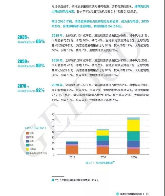 2018全球能源互聯(lián)網(wǎng)大會發(fā)布了《全球能源互聯(lián)網(wǎng)骨干網(wǎng)架研究》等多項成果。其推薦的2035年情景是,太陽能發(fā)電裝機22%,發(fā)電量16%。2050年太陽能發(fā)電裝機41%,發(fā)電量30%。