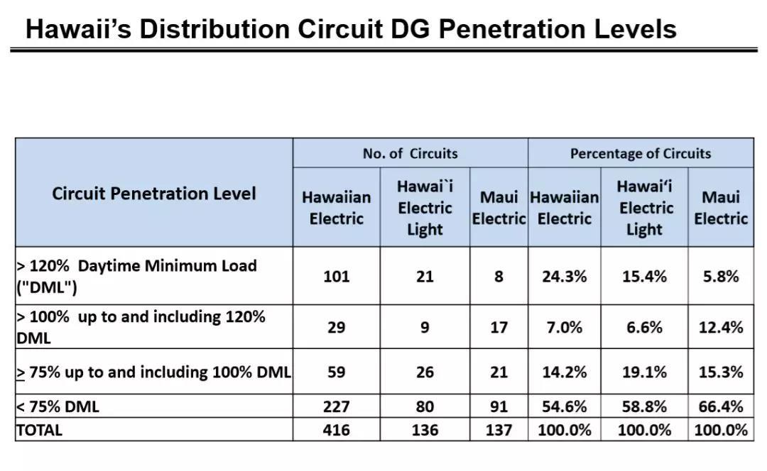 上表是2014年夏威夷電網(wǎng)分布式發(fā)電按白天最低負荷(DML)計算獲得的負荷滲透率情況。Hawaiian Electric 電網(wǎng)中,超過最低負荷75%的線路總計達到45.4%。