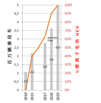 圖2 HEV市場(chǎng)及采用鋰離子電池比例增長(zhǎng)趨勢(shì)