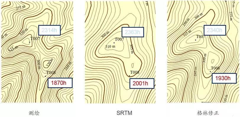 上圖是針對同一個項目中相同的兩個機位點在不同地形圖下計算的發(fā)電量結(jié)果,在T007機位采用SRTM、格林威治超分辨率地形圖與測繪圖的相對誤差分別為2.1%、1.1%,而T008機位采用SRTM、格林威治超分辨率地形圖與測圖的相對誤差分別為7.01%、3.2%。由此可見,機位處于地形相對簡單的T007處,SRTM和格林威治超分辨率地形圖的表現(xiàn)與測繪圖的差異并不大,但當機位處于T008這種相對復雜的地形,格林威治超分辨地形圖可以降低50%的誤差,進而減小了由地形圖帶來的發(fā)電量評估風險。