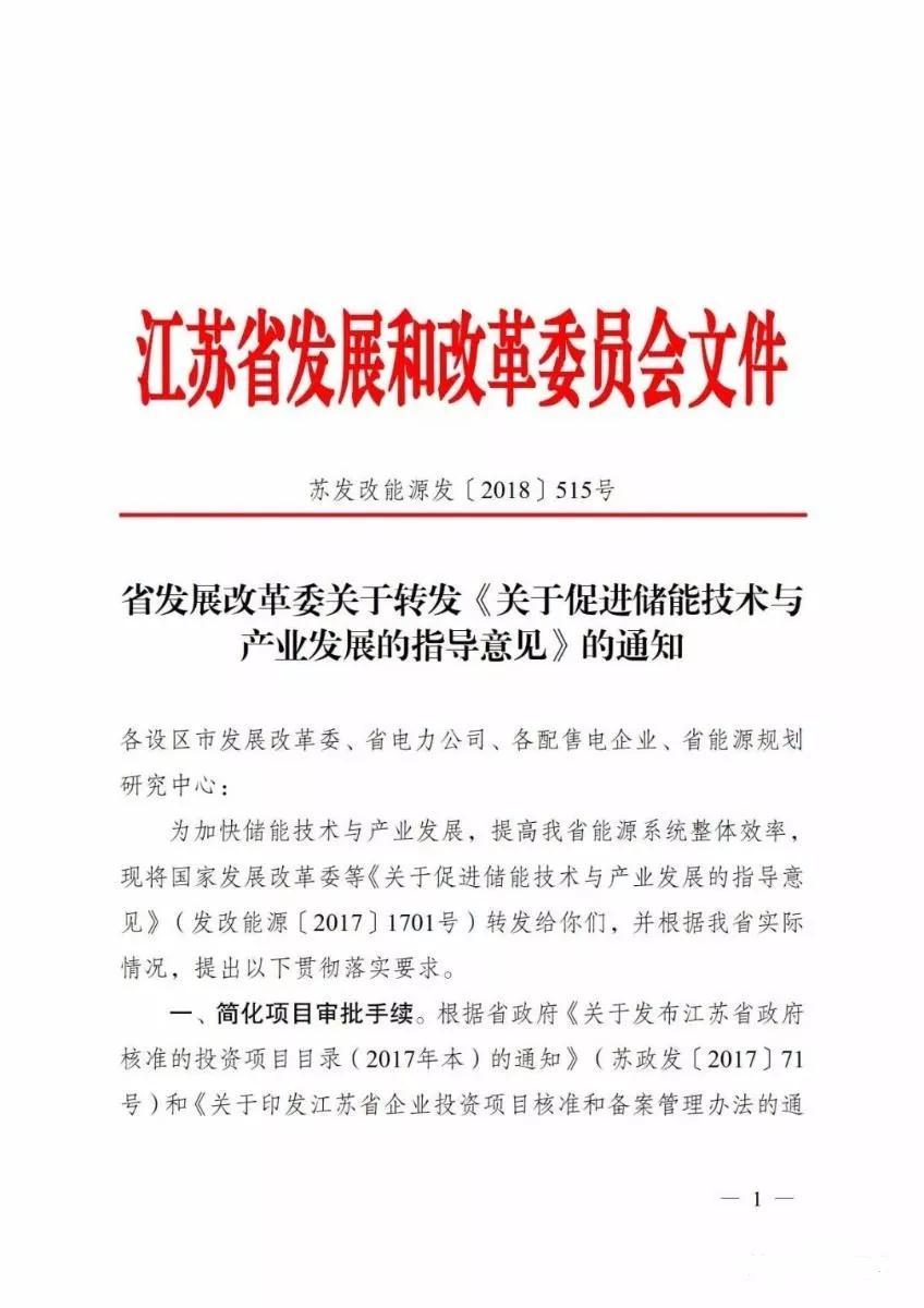 中國(guó)儲(chǔ)能網(wǎng)訊:6月1日,江蘇省發(fā)改委發(fā)布了《關(guān)于轉(zhuǎn)發(fā)<關(guān)于促進(jìn)儲(chǔ)能技術(shù)與產(chǎn)業(yè)發(fā)展的指導(dǎo)意見(jiàn)>的通知》。除要求加強(qiáng)貫徹去年10月五部委發(fā)布的儲(chǔ)能發(fā)展指導(dǎo)意見(jiàn)外,還特地提出“簡(jiǎn)化項(xiàng)目審批手續(xù)、加強(qiáng)規(guī)劃統(tǒng)籌發(fā)展和分級(jí)分類協(xié)調(diào)管理”等三大具體落實(shí)要求。