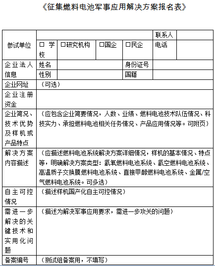 關(guān)于征集燃料電池軍事應(yīng)用解決方案的通知