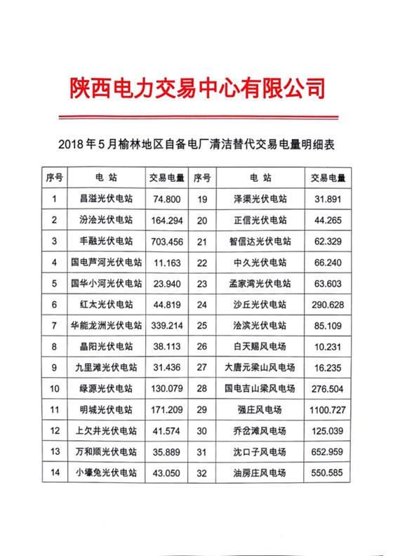 依據(jù)陜西省發(fā)改委《關(guān)于在榆林地區(qū)開(kāi)展清潔能源替代試點(diǎn)工作的函(陜發(fā)改運(yùn)行[2017]619號(hào))》文件精神要求,按照交易組織方案要求,現(xiàn)將2018年4-6月份榆林地區(qū)自備電廠(chǎng)清潔替代交易執(zhí)行情況公示如下,詳見(jiàn)附件。