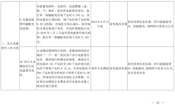 9.實施電能替代輸配電價政策。對新建電鍋爐、電窯爐,改造燃煤(油、柴、氣)鍋爐、窯爐的電能替代項目,執(zhí)行單一制輸配電價每千瓦時0.105元,其用電量實行預(yù)結(jié)制,到戶電價每千瓦時按0.38元收取;市場化交易完成后,按市場化交易結(jié)算到戶電價。對高爐渣提鈦行業(yè)自2018年1月1日起享受電能替代相關(guān)政策,執(zhí)行單一制輸配電價每千瓦時0.105元。