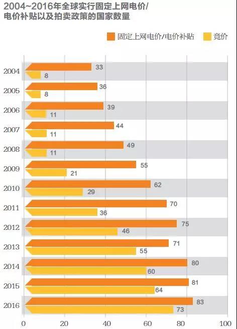 在所有的政策類型之中,采用固定電價(jià)(或上網(wǎng)電價(jià)補(bǔ)貼)與拍賣機(jī)制的國(guó)家數(shù)量最多,到2016年分別達(dá)到了83個(gè)和73個(gè)。