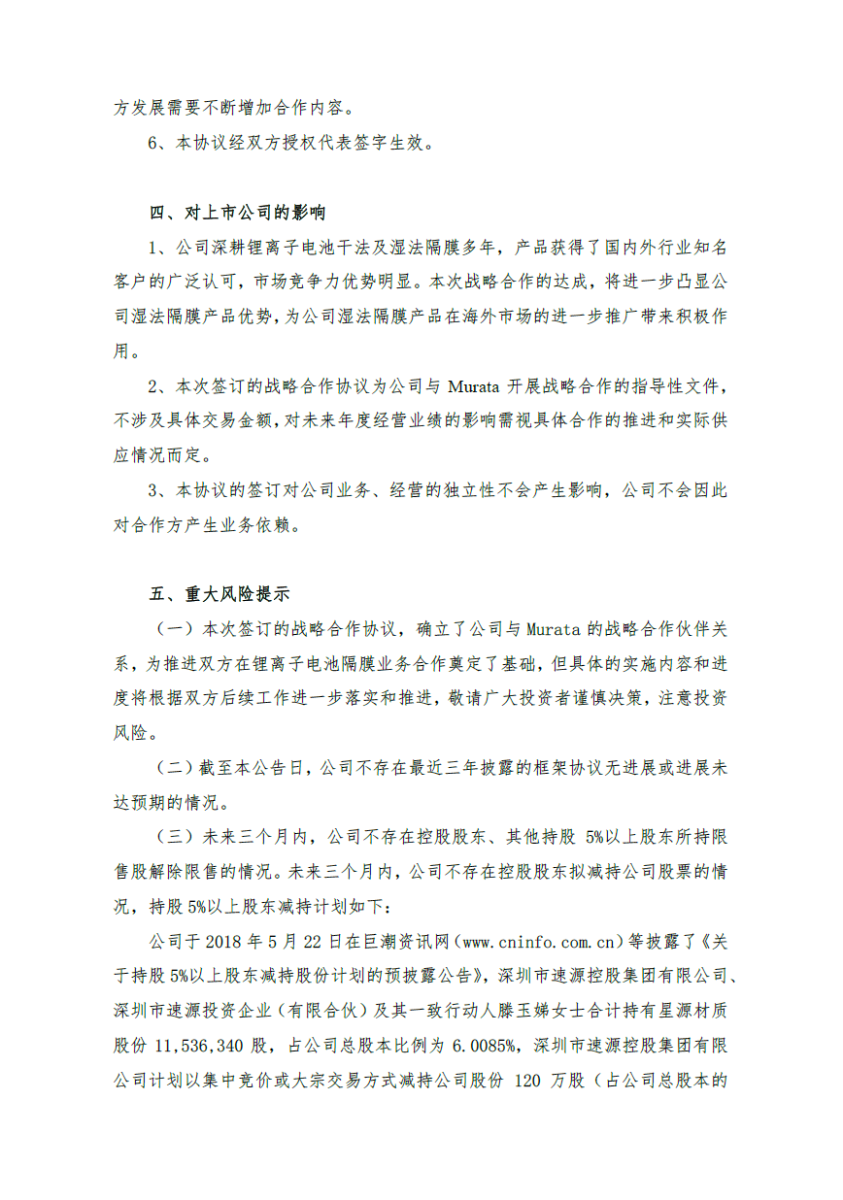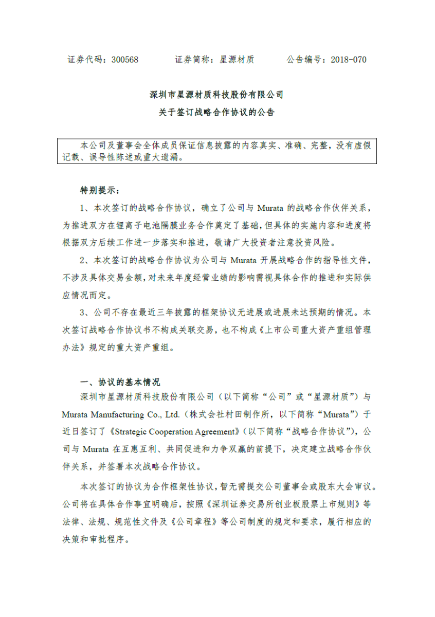 根據(jù)協(xié)議,Murata 將星源材質(zhì)視為其鋰離子電池隔膜的優(yōu)先供應商,在星源材質(zhì)的隔膜產(chǎn)品滿足 Murata 要求的前提下,Murata 將優(yōu)先考慮向星源材質(zhì)采購鋰離子電池隔膜,而星源材質(zhì)提供給Murata 的產(chǎn)品價格將不高于相同規(guī)格型號產(chǎn)品在類似商務(wù)條件下出售給其他客戶的價格。