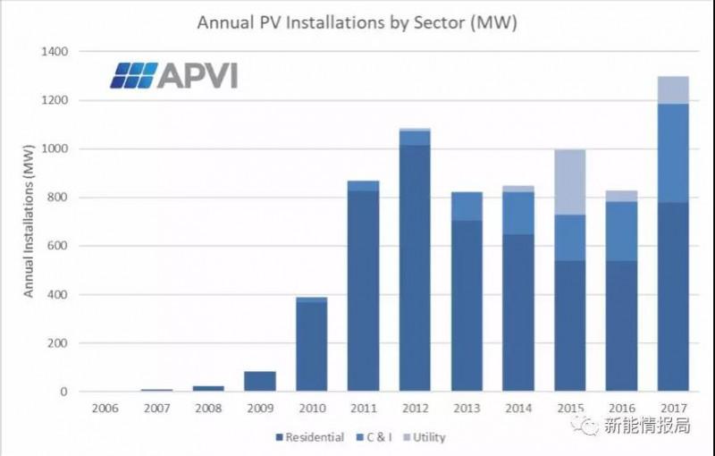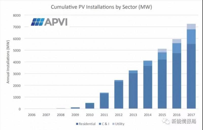 從2012-2016,澳大利亞的戶用裝機(jī)量一直在下滑,但是在2017年卻增長(zhǎng)了44%,由541MW增加到了779MW。