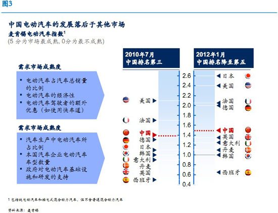 麥肯錫的電動(dòng)汽車指數(shù)可以被用來衡量一個(gè)國家是否有足夠準(zhǔn)備支持電動(dòng)汽車產(chǎn)業(yè)。該指數(shù)從供給和需求角度對(duì)一個(gè)國家的電動(dòng)汽車成熟度進(jìn)行評(píng)估:根據(jù)本國汽車廠商規(guī)劃的電動(dòng)汽車產(chǎn)量等指標(biāo)進(jìn)行供給衡量,根據(jù)對(duì)車主提供的優(yōu)惠措施和基礎(chǔ)設(shè)施投資水平等指標(biāo)進(jìn)行需求衡量。麥肯錫的電動(dòng)汽車指數(shù)表明中國在供給和需求的得分都相對(duì)較低。而且中國電動(dòng)汽車整體成熟度從2010年7月的第三位降至2012年2月的第五位,排在日本、美國、法國和德國之后(圖3)。