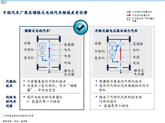 中國式電動(dòng)汽車可能會(huì)是增程式電動(dòng)汽車。我們的研究表明,增程式電動(dòng)汽車(即串聯(lián)式插電式混合動(dòng)力汽車)— 內(nèi)置小型內(nèi)燃機(jī)以在行駛過程為電池不斷充電的電動(dòng)汽車,可能對(duì)于中國相對(duì)滯后的汽車行業(yè)來講成本更低、也更容易實(shí)施。
