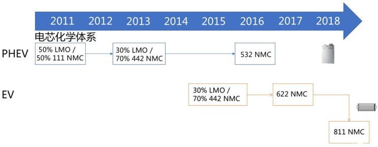 動力電池從磷酸鐵鋰往三元鋰路線的轉移并不是一蹴而就,如下圖所示,在國內快速轉化之前,國外電池企業(yè)已經(jīng)在電芯化學體系上做了一些變革。之所以給我們“忽如一夜春風來”的感覺,主要還是我們在磷酸鐵鋰的路線上堅持了比較長的時間。當2016年以后普遍轉向三元鋰電芯開發(fā),一下子跟上了日韓的技術路徑。