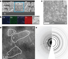 電子顯微鏡圖像顯示的橫斷面,屬于硅上的CsSnI3/TiO2電池。來源:西北大學