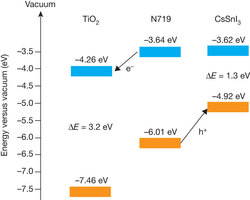 不同于格拉茲爾電池,這種新型太陽能電池既使用n型也使用p型半導體,而且使用單層染料分子,作為兩者之間的結。每個近似球形的納米粒子,都是用二氧化鈦(titanium dioxide)制成,都是一種n型半導體。卡納其迪斯銫錫碘薄膜材料是一種新型可溶性P型半導體。