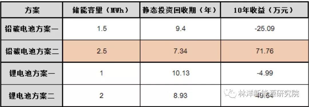 在四個方案里,鉛碳電池方案二投資收益最好,10年投資收益可以達到71.76萬元。