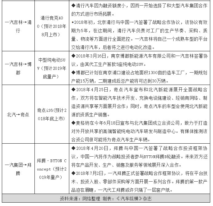一汽大概是目前代工最多的企業(yè),來自貴州的新造車勢力新特汽車、由汽車設(shè)計公司出身的博郡汽車、清華汽車工程系背景的新造車公司清行汽車,先后找上了一汽集團旗下的一汽轎車和一汽吉林,簽署了內(nèi)容大同小異的代工協(xié)議。而另一家新勢力企業(yè)——拜騰,則直接由一汽集團出手,從戰(zhàn)略投資擴大到零部件采購、產(chǎn)品研發(fā)等環(huán)節(jié),盡管雙方始終未用“代工”來形容合作關(guān)系,但拜騰未獲生產(chǎn)資質(zhì)的情況下,2019年就要量產(chǎn)首款車,只能依靠代工模式(當然也不排除坊間流傳的通過收購一汽華利獲得生產(chǎn)資質(zhì)),從這方面來說一汽代工拜騰或許只隔了一層窗戶紙,捅破是早晚的事。
