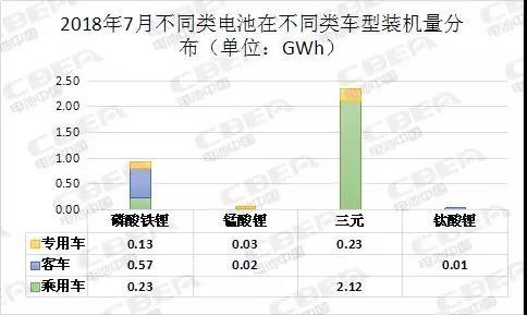 從不同類型電池來(lái)看,7月3.34Gwh裝機(jī)總量中,三元?jiǎng)恿﹄姵匮b機(jī)量為2.35 Gwh,占比達(dá)70.26%;磷酸鐵鋰動(dòng)力電池裝機(jī)量為0.93 Gwh,占比為27.81%;錳酸鋰動(dòng)力電池裝機(jī)量為0.05 Gwh,占比為1.59%;鈦酸鋰動(dòng)力電池裝機(jī)量為0.01 Gwh,占比為0.33%。