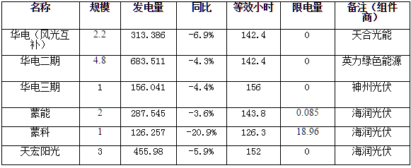 從各風(fēng)電場項(xiàng)目來看,華電風(fēng)光互補(bǔ)電場2.2萬千瓦光伏發(fā)電場發(fā)電量為313.386萬千瓦時,等效發(fā)電小時約為142.4小時;華電二期4.8萬千瓦光伏發(fā)電場發(fā)電量為683.511萬千瓦時,等效發(fā)電小時約為142.4小時;華電三期1萬千瓦光伏發(fā)電場發(fā)電量為156.041萬千瓦時,等效發(fā)電小時約為156小時,為我市7月份光伏等效利用小時數(shù)最高;蒙能新能源2萬千瓦光伏發(fā)電場發(fā)電量為287.545萬千瓦時,等效發(fā)電小時143.8小時;蒙科金太陽1萬千瓦光伏發(fā)電場發(fā)電量為126.257萬千瓦時,等效發(fā)電小時126.3小時;天宏陽光3萬千瓦光伏發(fā)電場發(fā)電量為455.98萬千瓦時,等效發(fā)電小時152小時。