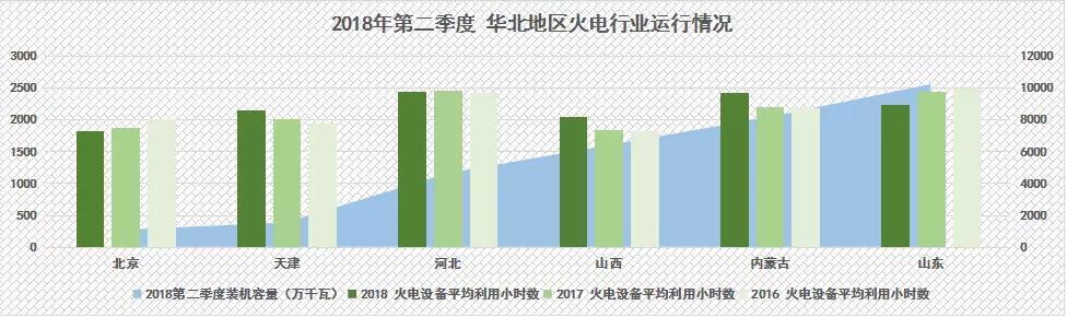 第二季度,華北地區(qū)總體處于較高水平,除北京以外,其余省份均超過2000小時,其中內(nèi)蒙古達(dá)到2429小時居于全國首位。與去年同期相比,華北地區(qū)火電設(shè)備平均利用小時數(shù)普遍實現(xiàn)增長,內(nèi)蒙古、山西,增幅高達(dá)229小時、207小時。值得關(guān)注的是,山東省第二季度火電設(shè)備平均利用小時數(shù)已經(jīng)連續(xù)三年下滑,下滑幅度高達(dá)197小時。