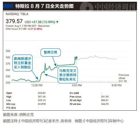 特斯拉股票在當(dāng)日下午恢復(fù)交易并以379.57美元收盤,漲幅10.99%,成交量是此前日均成交量的約4倍。特斯拉的幾個(gè)空頭接受媒體采訪時(shí),怒斥特斯拉在私有化過(guò)程中缺乏足夠的透明度,并質(zhì)疑特斯拉如何進(jìn)行融資以完成私有化交易。