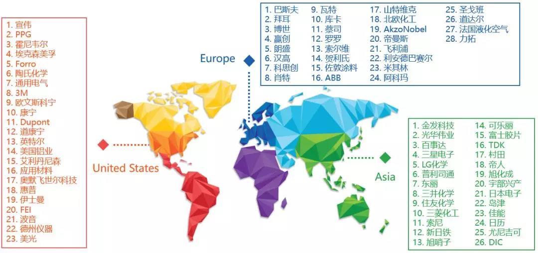 經(jīng)過第二、三次工業(yè)革命的洗禮,美國誕生了一大批新材料產(chǎn)業(yè)的巨頭,如化工行業(yè)的宣偉、PPG、陶氏、??松梨?,納米與半導(dǎo)體行業(yè)的應(yīng)用材料、德州儀器、英特爾,以及航空航天行業(yè)的通用電氣、波音等。目前,美國依然擁有全球最大體量的經(jīng)濟(jì),最龐大的科技人才團(tuán)體,最具創(chuàng)新活力的企業(yè)與產(chǎn)業(yè)集群。在可預(yù)見的未來,美國將依然是新材料行業(yè)的執(zhí)牛耳者。