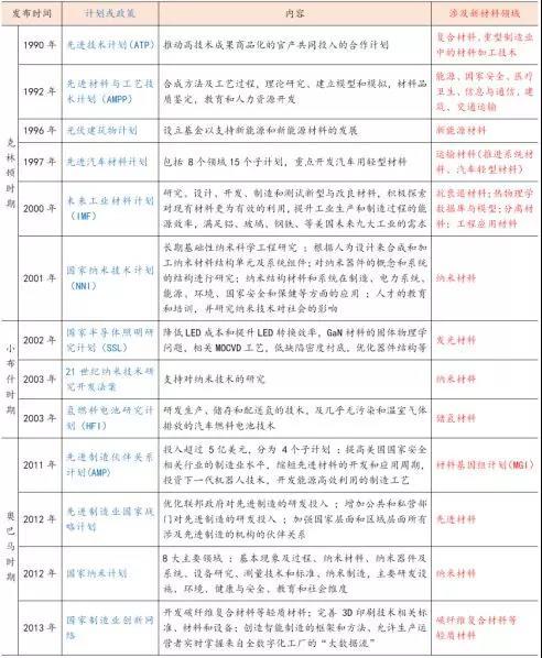克林頓時期,美國政府出臺《技術(shù)促進(jìn)美國經(jīng)濟(jì)增長 :建設(shè)經(jīng)濟(jì)實力的新方向》政策報告,旨在振興美國制造業(yè)。在此框架下,美國先后發(fā)布《未來工業(yè)材料計劃》、《國家納米技術(shù)計劃》等一系列重大科技創(chuàng)新計劃。克林頓時期,美國新材料技術(shù)不斷取得新突破,在空間材料、超導(dǎo)材料、生物材料、能源材料等領(lǐng)域全球領(lǐng)先。