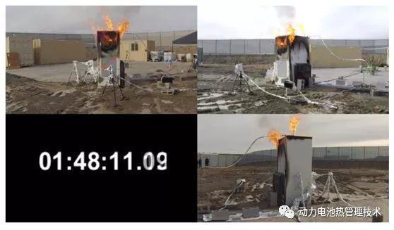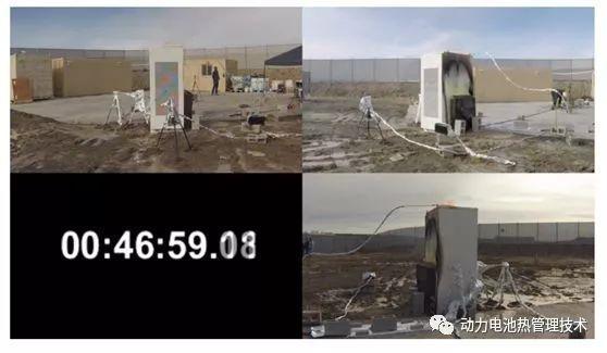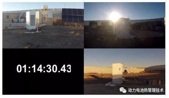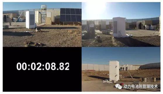 閑話少說,直接看實(shí)驗(yàn)過程,儲能系統(tǒng)布置在空曠的室外,采用兩個(gè)100KWh的儲能單元,實(shí)驗(yàn)前電池處于滿電態(tài),分別對電池進(jìn)行外部及內(nèi)部加熱,觸發(fā)電池?zé)崾Э?,使其發(fā)生燃燒甚至爆炸。