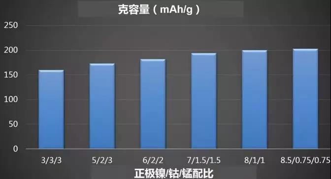 在圖5中幾種典型三元材料中可以看出,鎳的占比越來越高,鈷的占比越來越低。鎳的含量越高,意味著電芯的比容量就越高。另外,由于鈷資源稀缺,提高鎳的比例,將降低的降低鈷的使用量。