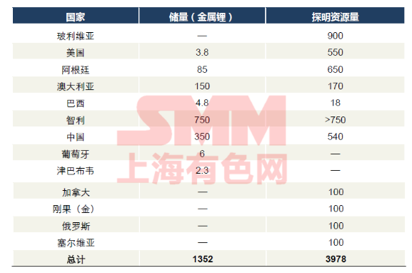 根據(jù)美國(guó)地質(zhì)調(diào)查局公布的數(shù)據(jù),世界鋰資源儲(chǔ)量(金屬鋰)總計(jì)為1,352萬(wàn)噸,探明資源量為3,978萬(wàn)噸。其中世界探明資源量排名前十一位為玻利維亞、智利、阿根廷、美國(guó)、中國(guó)、澳大利亞、加拿大、剛果(金)、俄羅斯、塞爾維亞和巴西。