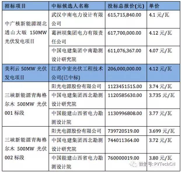 中國儲能網(wǎng)訊:不久前,三峽新能源公示青海省格爾木500MW和陜西渭南100MW光伏發(fā)電應(yīng)用領(lǐng)跑者項目EPC總承包中標候選人,陽光電源分別以約為3.745元/瓦、3.699元/瓦、4.847元/瓦的單瓦報價位列兩個招標共三個標段的第一候選人。