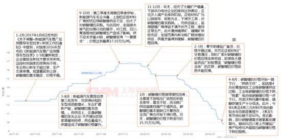 2月至3月的平穩(wěn)期,主因春節(jié)鉛鋰鹽廠備貨,價格平穩(wěn)過渡,而節(jié)后正極材料廠交易清淡,同時廠家對碳酸鋰價格后續(xù)走勢表示悲觀,所以即使各大鋰鹽供應廠積極營造“碳酸鋰價格走勢會漲”的態(tài)勢,碳酸鋰的價格依舊未能反彈,仍是橫盤兩月。但一進入四月,由于碳酸鋰的供應過剩,價格也應聲下跌。據(jù)調(diào)研得知,4月起持續(xù)下行的碳酸鋰價格,源于4月青海地區(qū)工業(yè)級碳酸鋰的供應過剩,工業(yè)級碳酸鋰拖累了電池級碳酸鋰的價格,同時加上沃特瑪事件,磷酸鐵鋰的生產(chǎn)十分低迷。持續(xù)累加的碳酸鋰庫存,加之二季度三元需求的疲軟,雖然期間四川某上市鋰冶煉廠停產(chǎn)檢修,但是也無法阻擋碳酸鋰持續(xù)下跌的走勢。為了更好地理解碳酸鋰的發(fā)跡史與落日史,整理了近兩年的碳酸鋰走勢并給出了原因詳解。