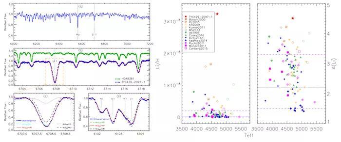 右圖:已知的富鋰巨星中鋰豐度的對(duì)比。其中紅色五角星為本工作所發(fā)現(xiàn)的富鋰巨星,兩個(gè)縱坐標(biāo)分別為分別為L(zhǎng)i/H和A(Li)。