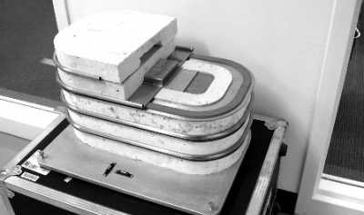早期的液態(tài)金屬電池實物模型,顯示出堆疊在一起的電池單元。由厚厚的一層泡沫絕緣材料包裹著處于核心位置的電池。中心處的彩色材料片代表著熔化了的電池材料。 |