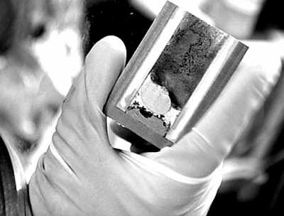 液態(tài)金屬電池的制造技術(shù)已經(jīng)逐步升級。這里顯示了幾種電池,從直徑1英寸(約2.54厘米)的到目前最大的40厘米電池(表面有三個圓孔的)都有。在每個電池內(nèi),都含有兩種金屬用來充作電極材料和電解質(zhì)。液態(tài)金屬的得名源于這兩種金屬通過加熱過程,最終融化為液態(tài),經(jīng)過自然分隔,形成三個不同的層次,以滿足電池的運(yùn)行。 |