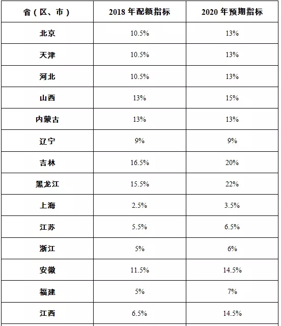 2 、各省級行政區(qū)域2018、2020年非水電配額指標