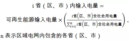 5、跨省跨區(qū)可再生能源電力交易,存在“省送省”、“省送區(qū)域”兩種情況。針對“省送區(qū)域”情況,如華東、華中接受外省輸入的可再生能源電量時,按該區(qū)域內各省全社會用電量占本區(qū)域電網內全社會用電量的比重,計算各省輸入的可再生能源電量。即:
