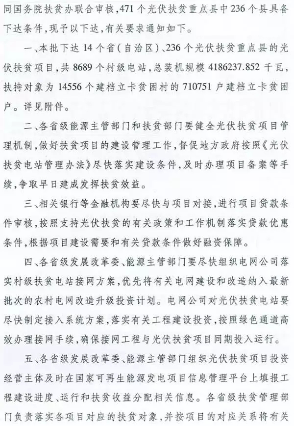 在地方組織編制“十三五”光伏扶貧實(shí)施方案的基礎(chǔ)上,經(jīng)國家能源局會同國務(wù)院扶貧辦聯(lián)合審核,471個光伏扶貧重點(diǎn)縣中的236個縣具備條件。