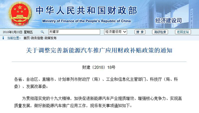 中國儲能網(wǎng)訊:伴隨著取消地方補(bǔ)貼和部分一線城市將推出地方補(bǔ)貼的流言聲,在2018年春節(jié)來臨之際,財政部、工信部、科技部、國家發(fā)改委四部委正式發(fā)出了《關(guān)于調(diào)整完善新能源汽車推廣應(yīng)用財政補(bǔ)貼政策的通知》(下稱《通知》),這也就意味著,2018年新能源車補(bǔ)貼政策已經(jīng)塵埃落定。
