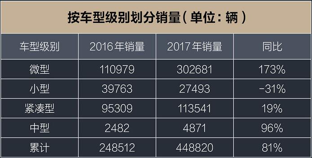 根據(jù)2017年純電新能源車的銷量來看,2017年純電乘用車?yán)塾嬩N量448820輛,相比2016年總體增長了81%,這其中,微型電動車?yán)塾嬩N量為30.2萬元,占比純電動乘用車總銷量的67.4%,同比2016年增長173%。