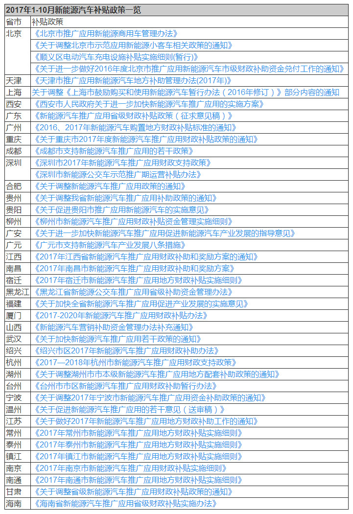 2017年7月,北京、深圳、廣州、重慶、成都、貴陽(yáng)、貴州、柳州、廣元、廣安、江西、宿遷、廈門13個(gè)省市出臺(tái)了2017新能源汽車補(bǔ)貼政策。
