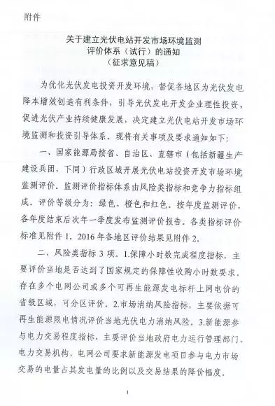 中國儲能網(wǎng)訊:日前,國家能源局綜合司發(fā)布《關(guān)于建立光伏電站市場開發(fā)環(huán)境監(jiān)測評價體系(試行)的通知》征求意見稿。
