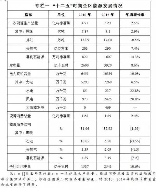 能源結(jié)構(gòu)不斷優(yōu)化?!笆濉逼陂g,全區(qū)能源結(jié)構(gòu)由傳統(tǒng)化石能源為主逐步向化石能源和非化石能源并重轉(zhuǎn)變,能源發(fā)展呈現(xiàn)出多元化、低碳化的特征。天然氣和非化石能源在一次能源生產(chǎn)總量中的比重分別提高至2015年的6.9%和2.9%,較2010年分別提高1.5個和1.2個百分點(diǎn);煤炭在一次能源生產(chǎn)總量中的比重降低至2015年的90%以下,較2010年下降2.6個百分點(diǎn);非化石能源裝機(jī)比重由2010年的16.4%提高至30.1%;非化石能源消費(fèi)比重提高至8.5%,“十二五”期間累計提高3.6個百分點(diǎn)。