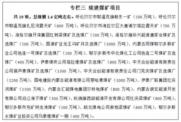 穩(wěn)步推進(jìn)煤炭生產(chǎn)基地建設(shè)。統(tǒng)籌安排煤炭總量和布局,依托勝利、五間房、白音華、準(zhǔn)格爾、東勝、上海廟、伊敏、寶日希勒等大型整裝煤田,按照國家總體能源戰(zhàn)略部署,重點(diǎn)圍繞保障煤電、現(xiàn)代煤化工等主要耗煤項目用煤需求,推動鄂爾多斯、錫林郭勒、呼倫貝爾三大煤炭生產(chǎn)基地建設(shè),力爭到2020年原煤產(chǎn)量控制在11.5億噸左右。“十三五”期間,建成投產(chǎn)煤礦項目35項,總規(guī)模2.5億噸左右。續(xù)建煤礦項目19項,總規(guī)模1.4億噸左右,其中鄂爾多斯1.2億噸、呼倫貝爾2000萬噸左右。圍繞煤電和煤化工基地配套用煤項目,擬新開工并建成煤礦項目16項,總規(guī)模1.2億噸左右,其中鄂爾多斯新增產(chǎn)能6500萬噸、錫林郭勒新增產(chǎn)能4500萬噸、通遼新增產(chǎn)能600萬噸左右。