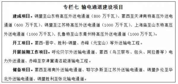 結(jié)合全國電力供需整體形勢、電源基地開發(fā)進(jìn)度等因素,堅持適度超前的原則,采用大容量、遠(yuǎn)距離、高效率的特高壓先進(jìn)輸電技術(shù),加快電力外送通道及配套接網(wǎng)工程建設(shè),進(jìn)一步提高電力外送規(guī)模?!笆濉逼陂g,建成錫盟-山東、錫盟-江蘇、上海廟-山東、蒙西-天津南、扎魯特-山東青州等特高壓外送電通道。爭取開工建設(shè)蒙西-晉中、勝利-錫盟、赤峰(元寶山)等外送輸電工程。結(jié)合受端市場情況,積極推進(jìn)呼倫貝爾、蒙西(烏蘭察布、包頭、阿拉善等)、赤峰-京津冀等電力外送通道論證。力爭到2020年電力外送形成“兩交三直”特高壓、多條超高壓外送通道格局。