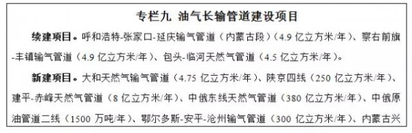統(tǒng)籌考慮自治區(qū)石油天然氣資源以及煤制燃料項目建設(shè)情況,進(jìn)一步完善油氣管網(wǎng),提高油氣供應(yīng)保障能力?!笆濉逼陂g,建成陜京四線、中俄東線、建平-赤峰、呼和浩特-張家口-延慶輸氣管道(內(nèi)蒙古段)、包頭-臨河、大路-和林格爾、察右前旗-豐鎮(zhèn)輸氣管道和中俄原油管道二線等項目。根據(jù)市場發(fā)展及油氣源項目建設(shè)情況,適時推進(jìn)訥河-阿榮旗、張家口至錫林浩特、烏蘭察布-二連浩特、烏蘭察布-桑根達(dá)來-錫林浩特、桑根達(dá)來-克什克騰旗、中俄西線、杭錦旗-銀川天然氣管道、呼倫貝爾-齊齊哈爾-哈爾濱煤制氣、西氣東輸五線輸氣管道和蒙西、蒙東煤制油外輸管道等項目的前期工作?!笆濉逼陂g,力爭新增輸油能力1500萬噸、輸氣能力657億立方米左右。加大油氣長輸管道安全隱患排查和整改力度,持續(xù)開展油氣長輸管道安全大排查、大整治專項行動。加強(qiáng)儲氣設(shè)施建設(shè),進(jìn)一步提高天然氣調(diào)峰和應(yīng)急儲氣能力。